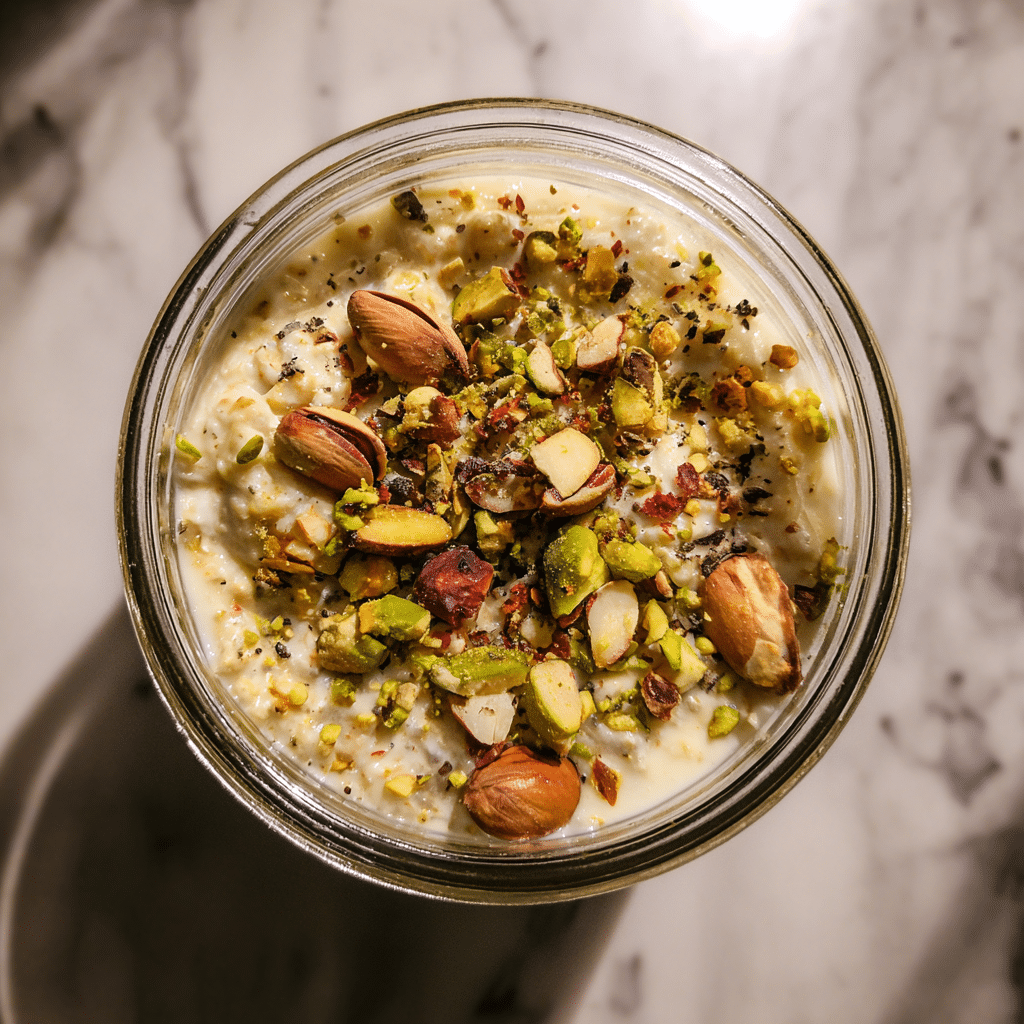 In the morning, give the oats a good stir. Add a splash of extra milk if you prefer a looser consistency. Top with additional pistachios, honey, fruit, or a spoonful of yogurt before serving. Enjoy chilled or gently warmed.