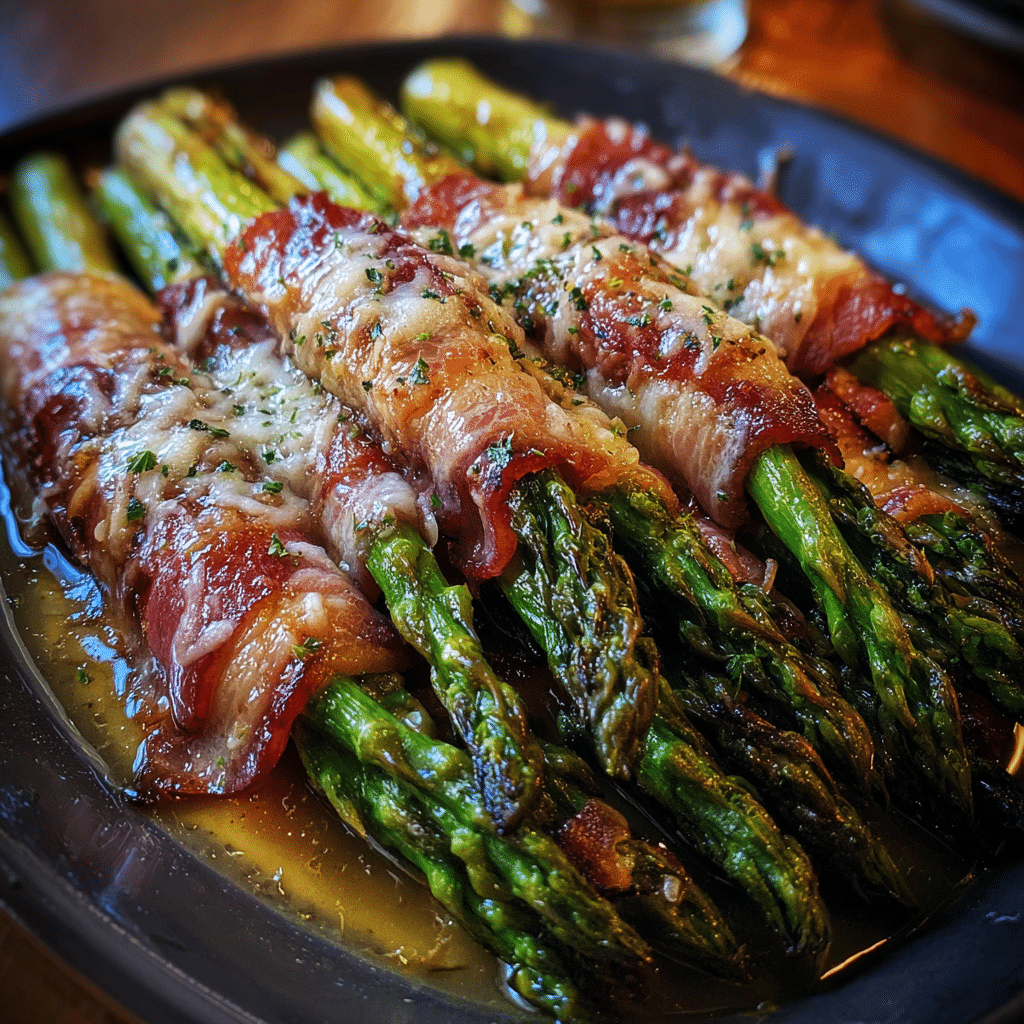 A savory roasted asparagus dish tossed with garlic, crispy bacon, and melted cheese, perfect as a flavorful side or light main.