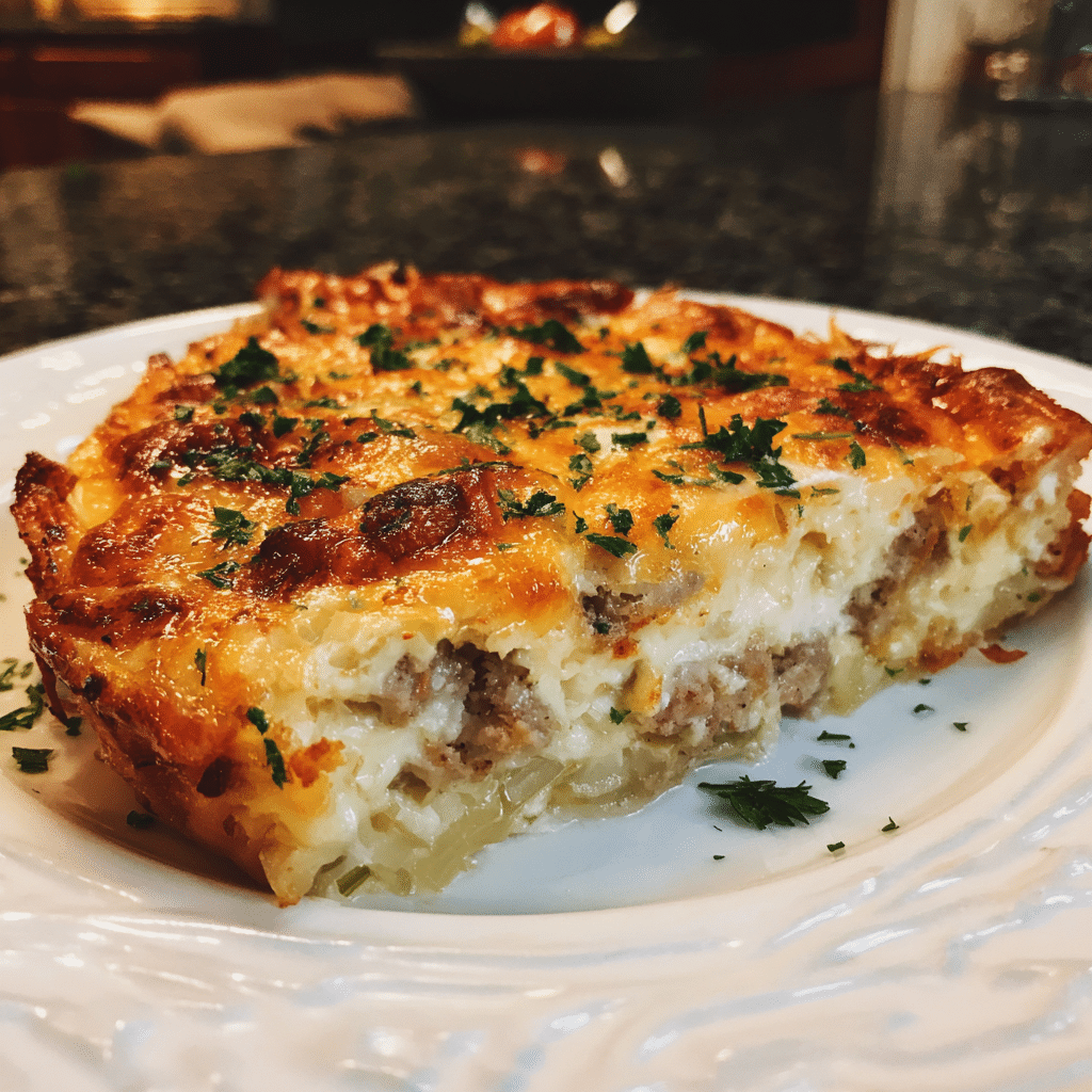 A hearty, comforting breakfast casserole layered with crispy hashbrowns, savory sausage, fluffy eggs, and creamy pockets of melted cream cheese—perfect for feeding a crowd.